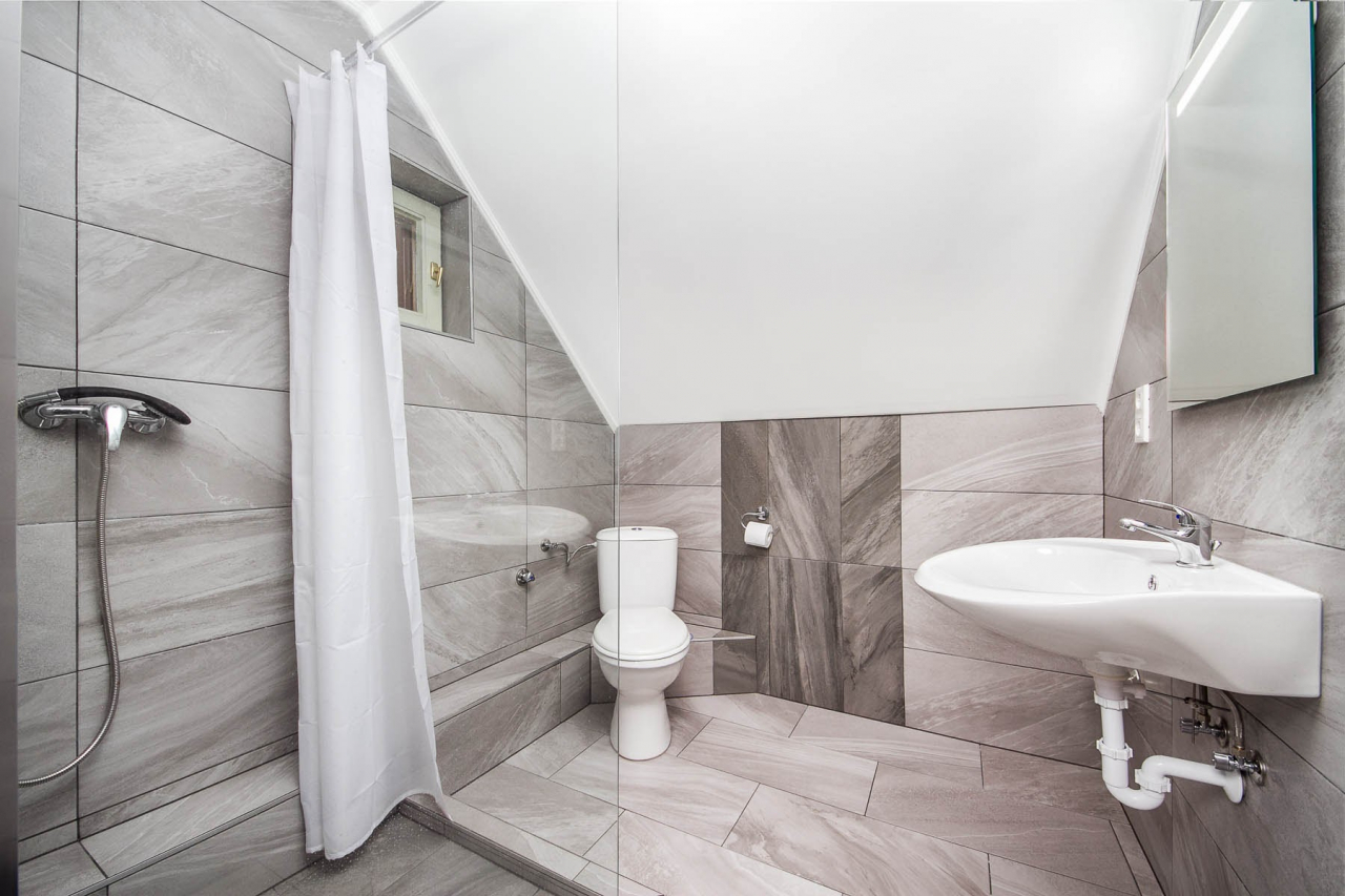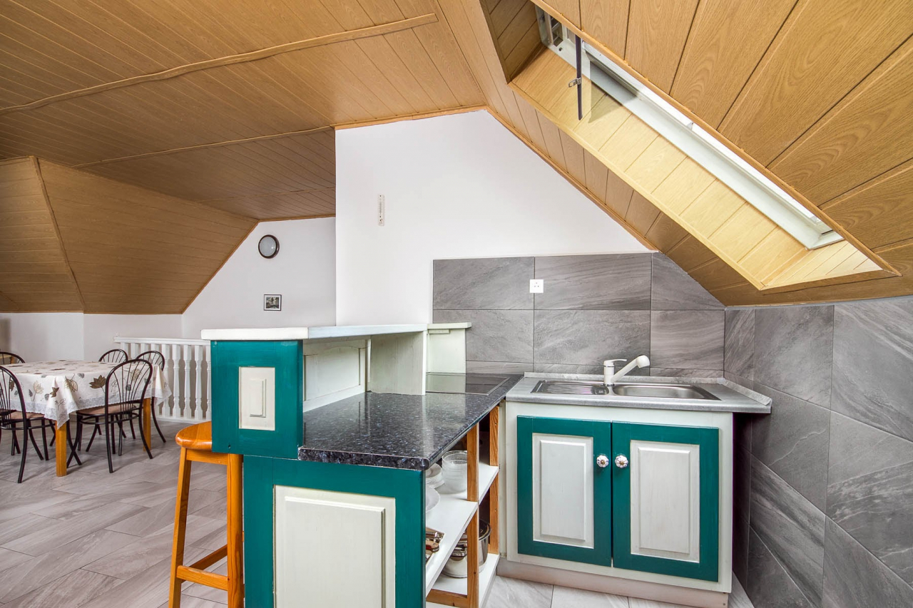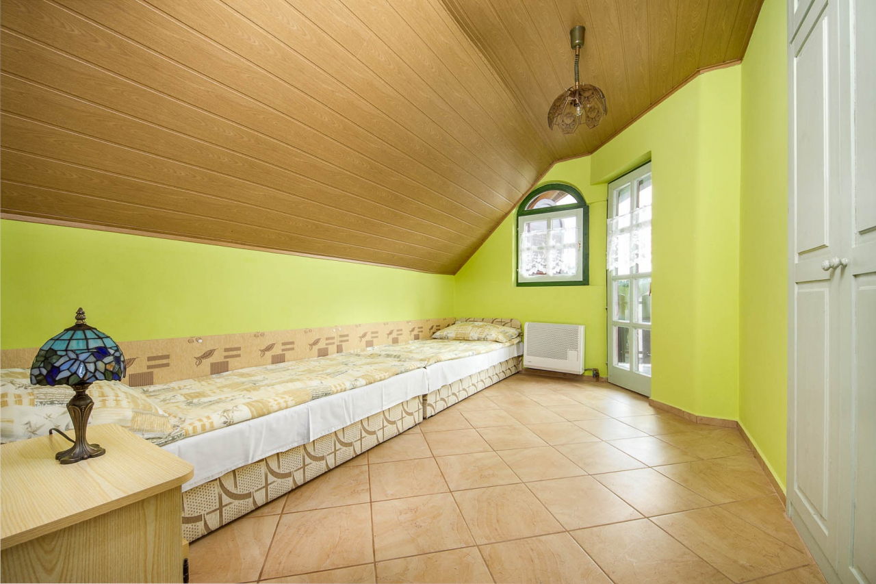 Emelet: Nappali étkezővel, am. konyhával és egy fekhellyel, két kétágyas szoba, zuhanyzó/WC, balkon.