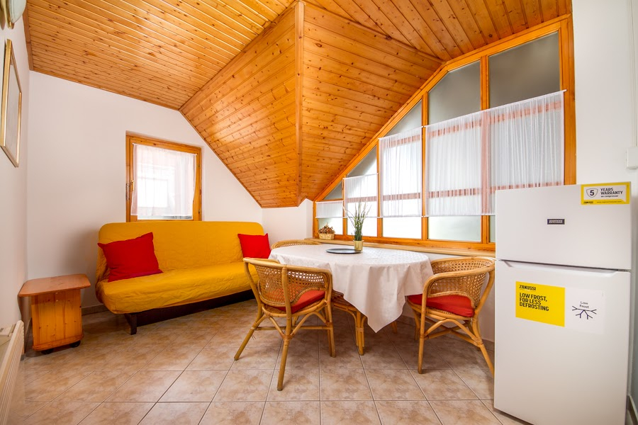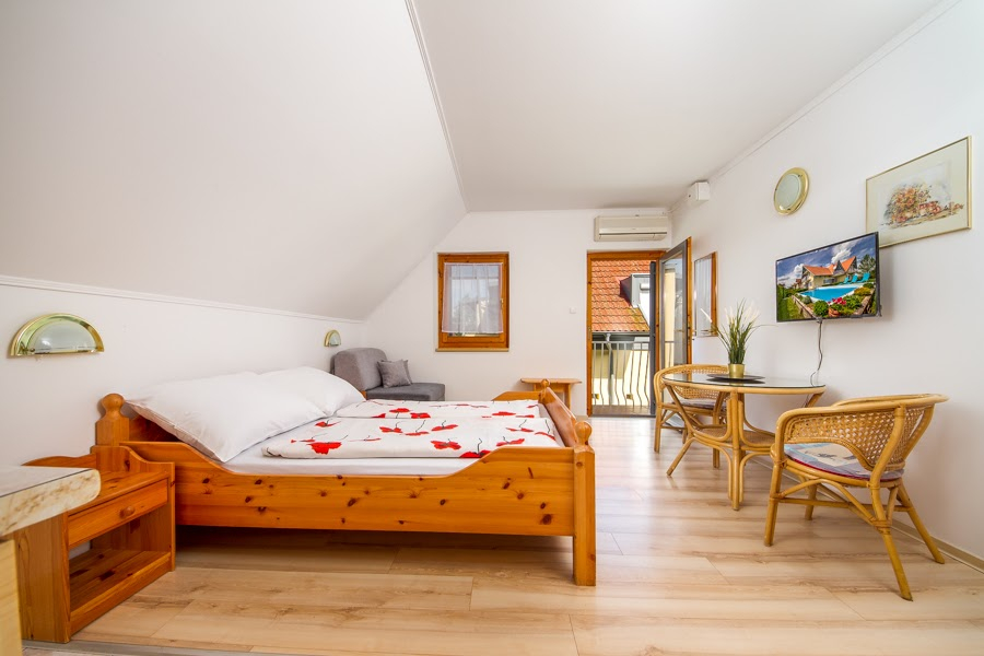 Emelet: Kis nappali-étkező egy fekhellyel, egy légkondicionált háromágyas szoba főzősarokkal, zuhanyzó/WC-vel, balkonnal, TV-vel, széffel.