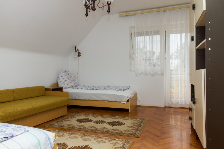 Emelet: Előtér, egy kétágyas szoba, egy háromágyas szoba, balkon.
