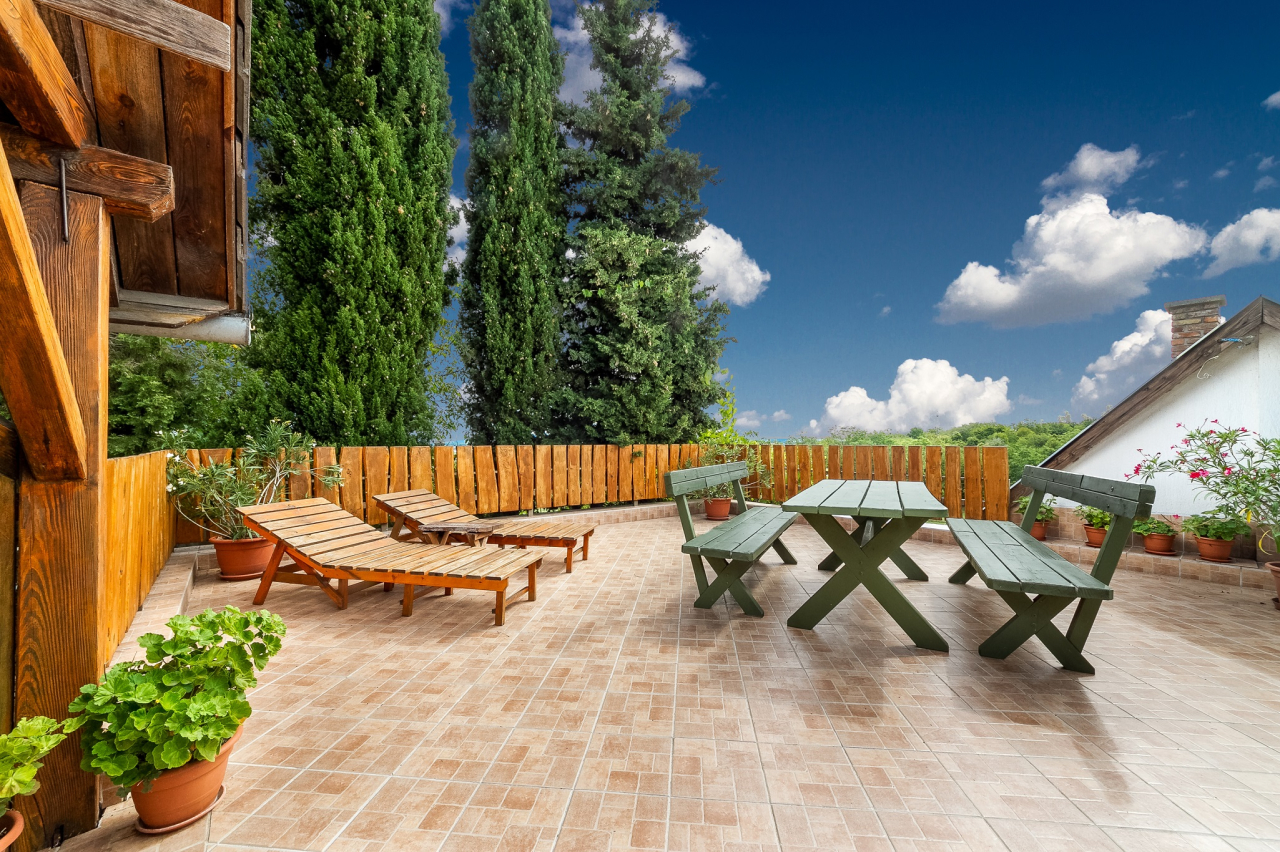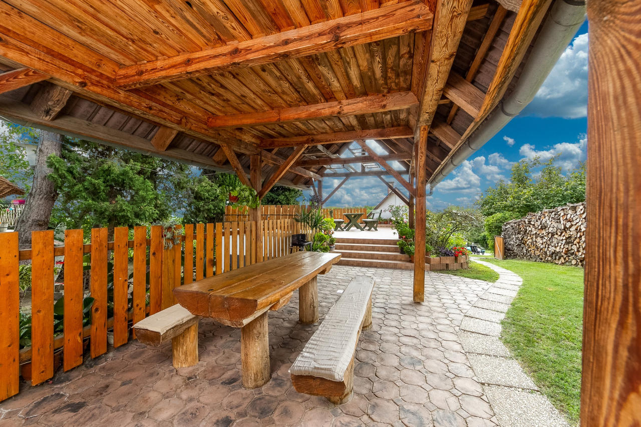 Földszint: Nappali-konyha-étkező, fürdőszoba/WC, nagy fedett terasz, nyitott terasz panorámás kilátással