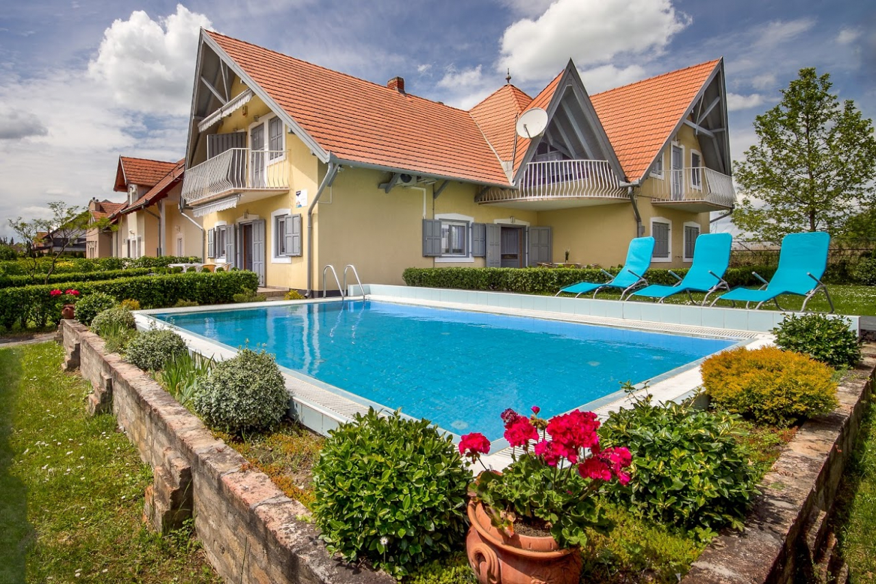 Szépen berendezett ikerház fele 6-8 főre medencével, klímával, mosógéppel, szárítóval, mosogatógéppel nyugodt helyen.